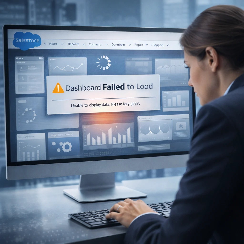 Salesforce help showing data sync or integration problems with error messages on software interface